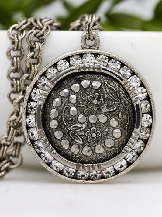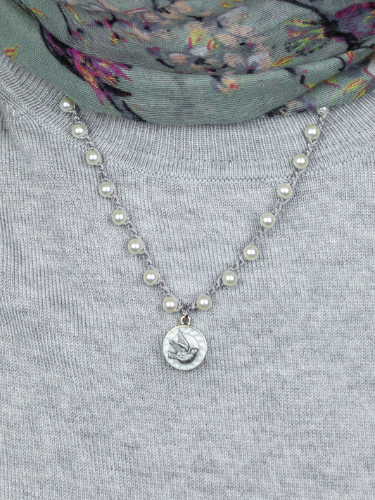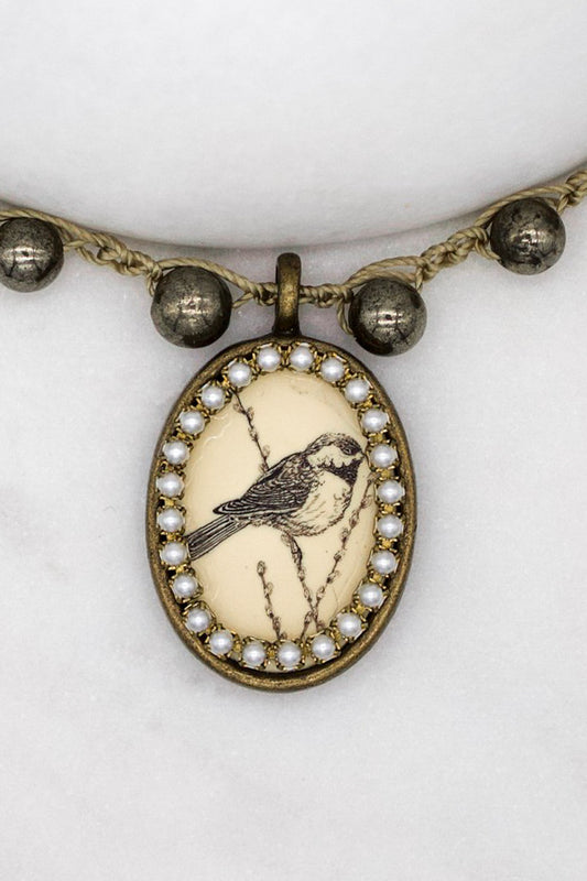 Vintage Etched Bird Necklace with Hand-Stitched Pyrite Stone Chain
