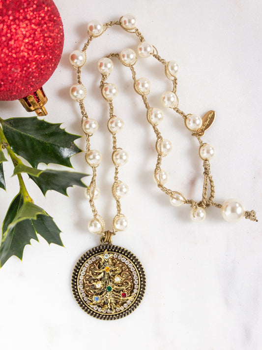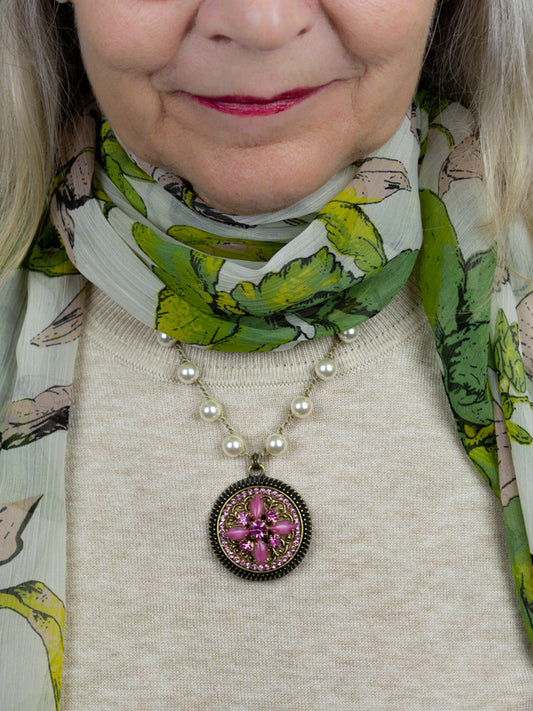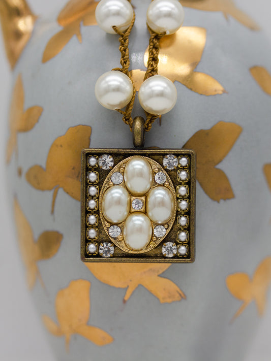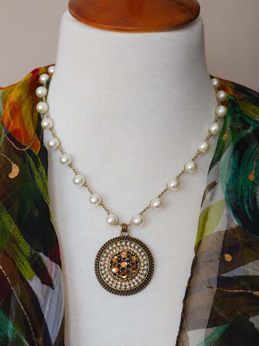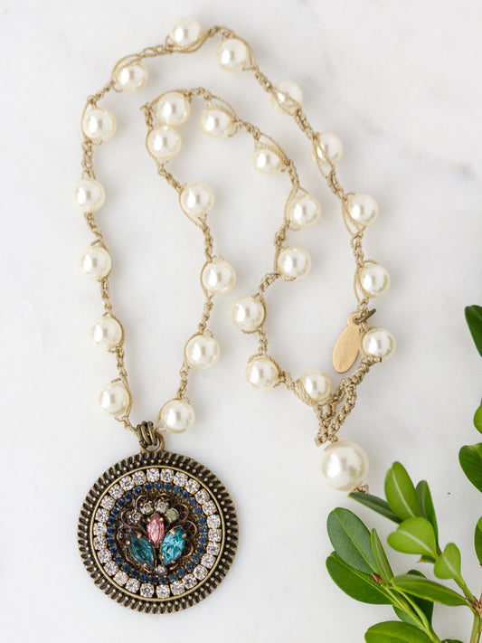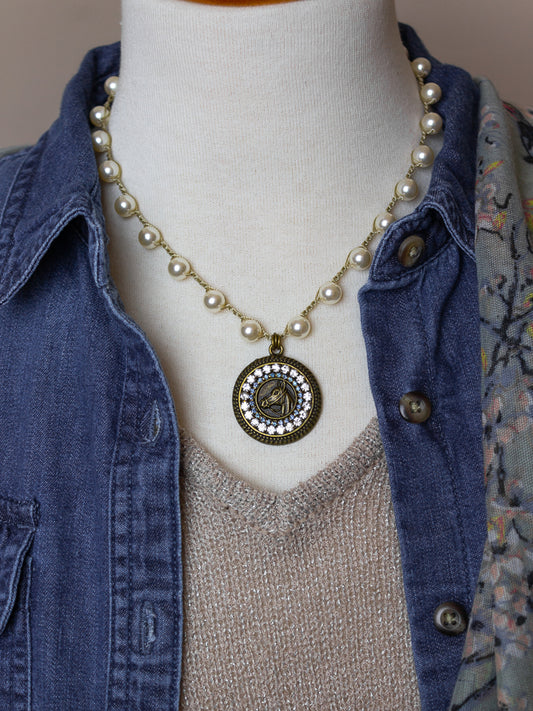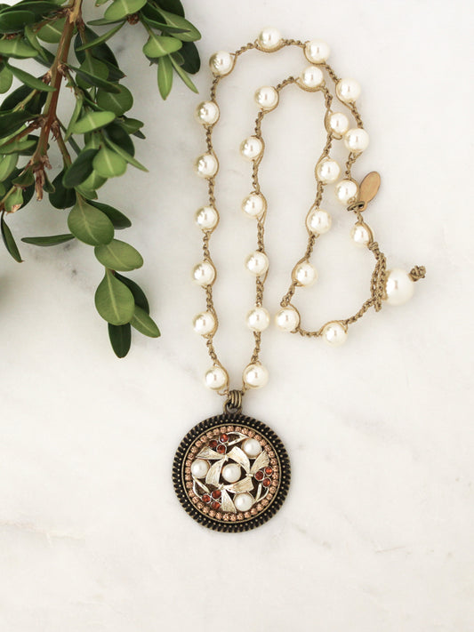 Vintage Leather Horse Button Necklace with Hand-Stitched Pearl Chain