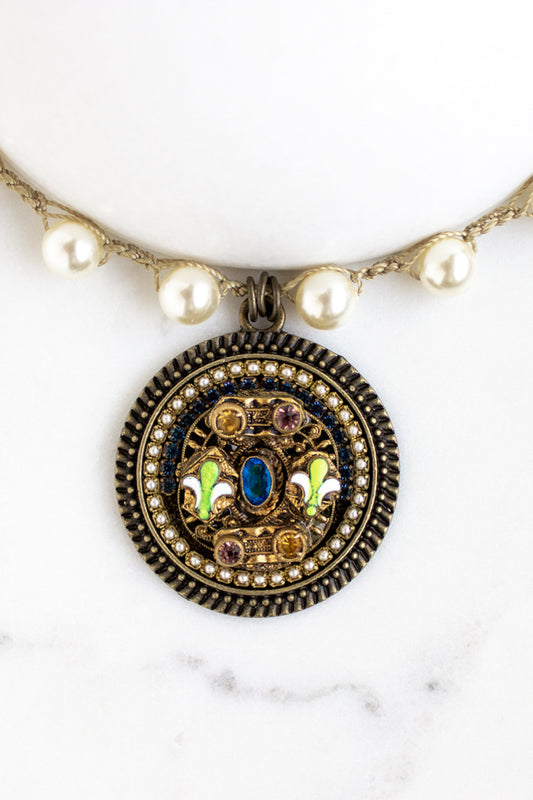 Vintage Fleur de Lis Necklace with Teal, Gold, Amethyst, and Green Stones