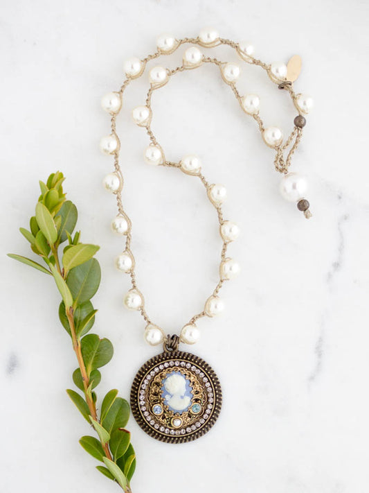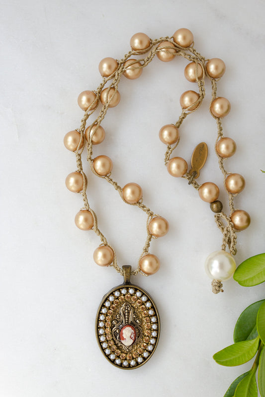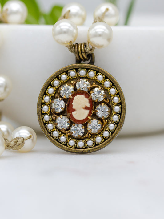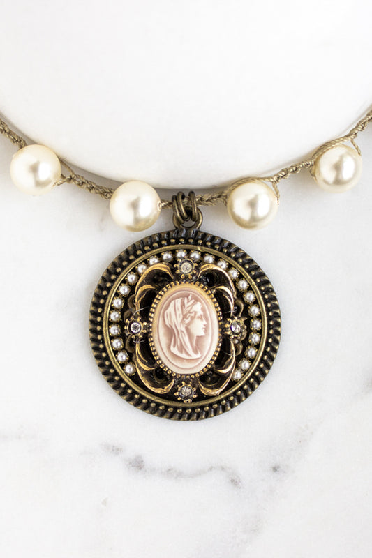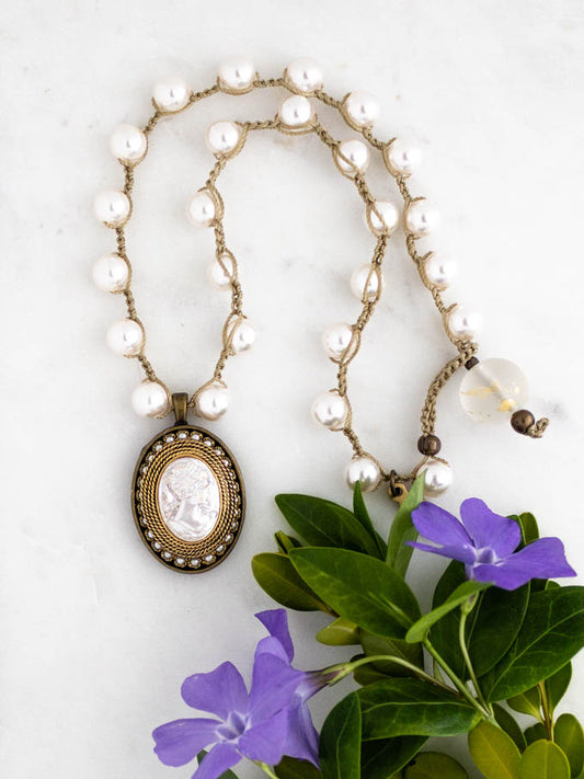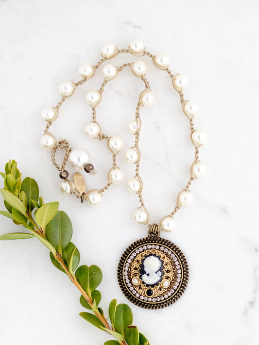 Vintage Grecian Cameo Necklace with Hand-Stitched Pearl Chain