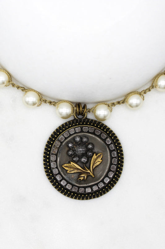 Antique Black Flower Button Necklace with Hand-Stitched Pearl Chain