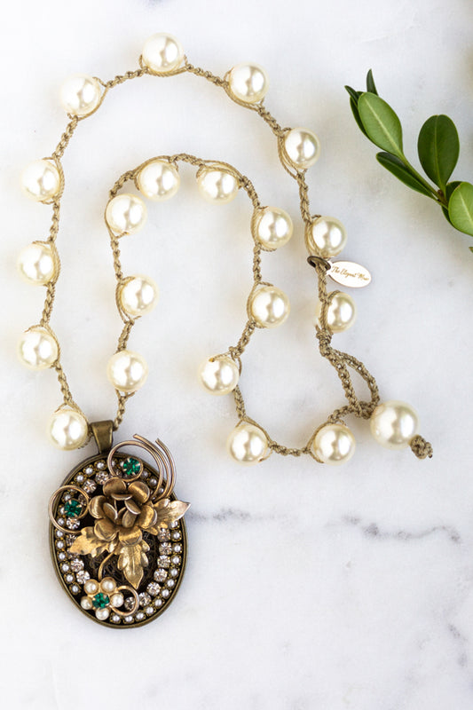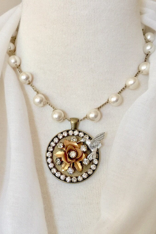Vintage Hummingbird Statement Necklace with Hand-Stitched Pearls