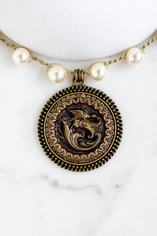 Vintage Dragon Button Necklace with Hand-Stitched Pearl Chain
