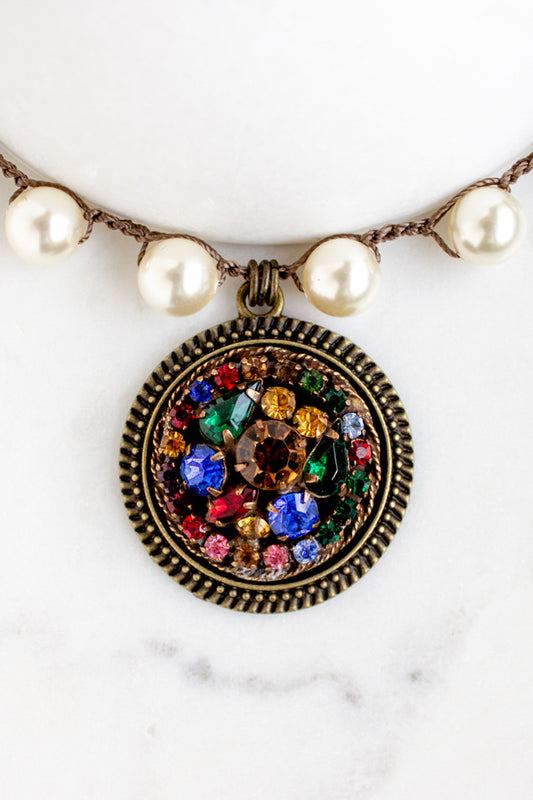 Repurposed Jewel-Toned Necklace with Hand-Stitched Pearl Chain