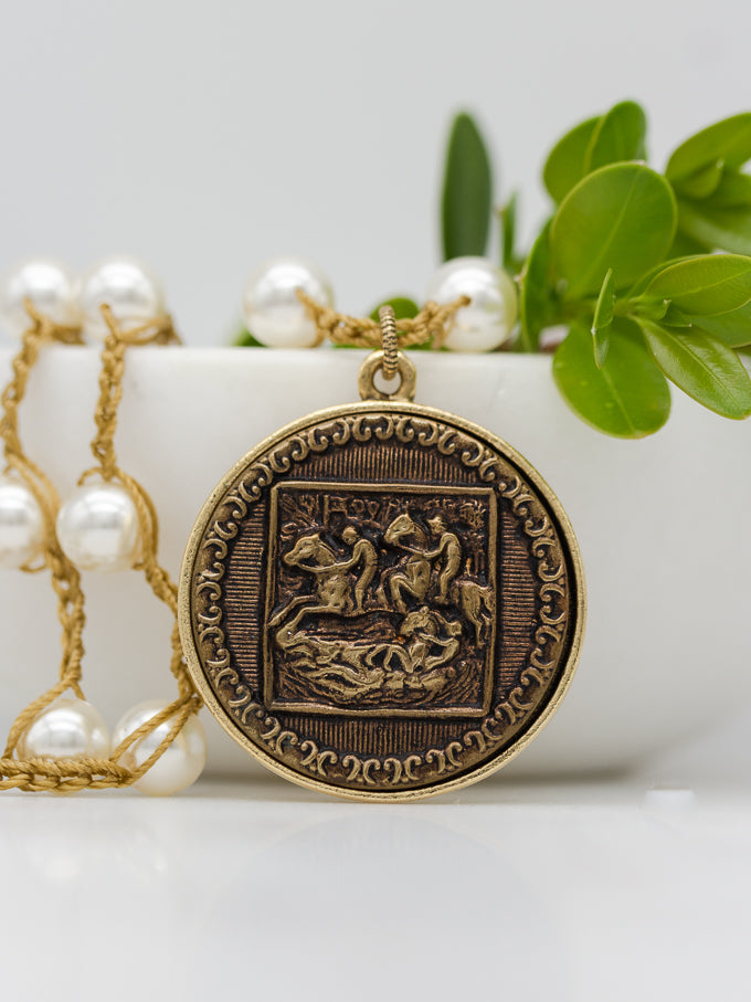 You can almost hear the horse's hooves pelting the ground before flying over the jump on this exquisitely detailed antique button necklace. The size of the button called for a longer, statement style string of pearls to match its elegance. Wear with your favorite denim or dressier attire.