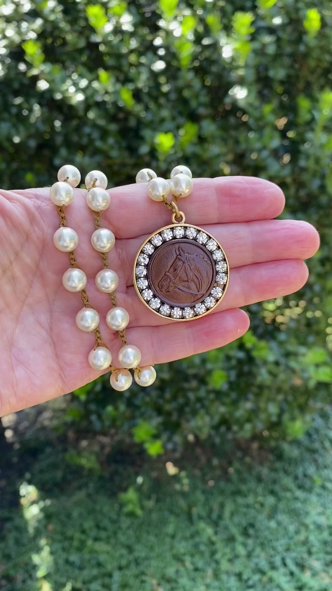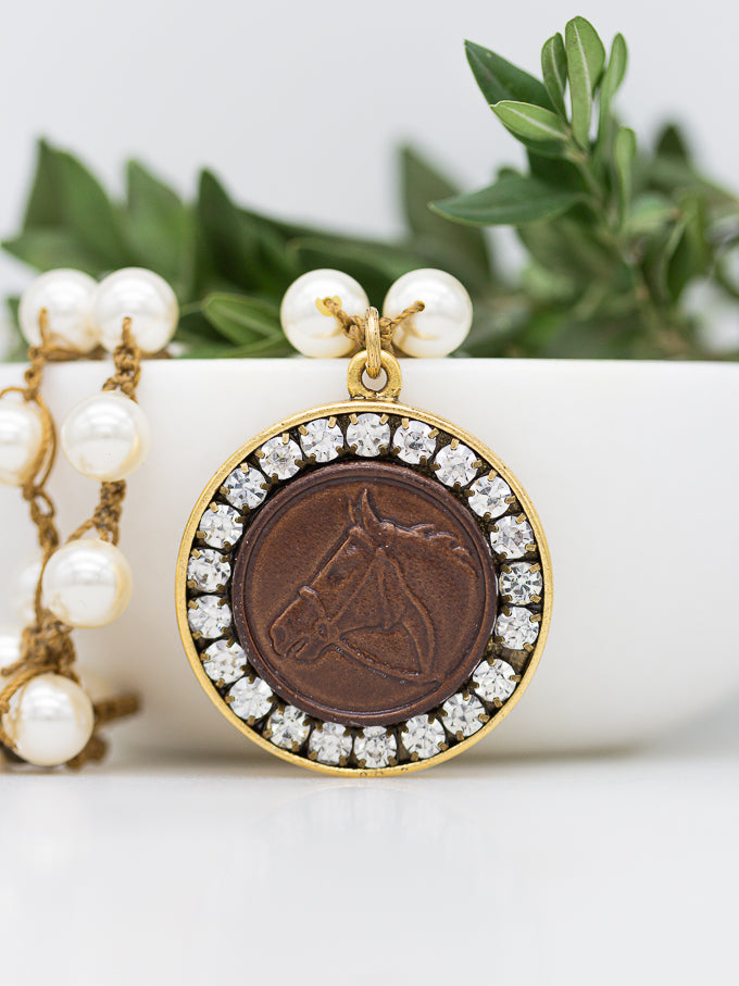 Show your love for all things equestrian or a special horse with the Chestnut necklace. Crafted using a vintage leather horse button and swirl of shimmering rhinestones, Chestnut is the perfect accessory to add a touch of elegant charm to any outfit in your wardrobe.