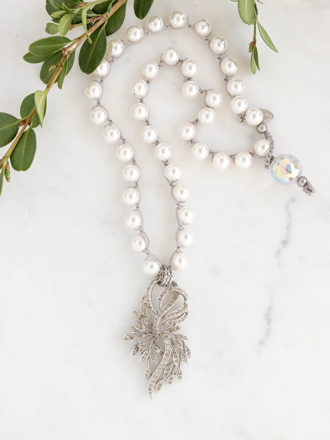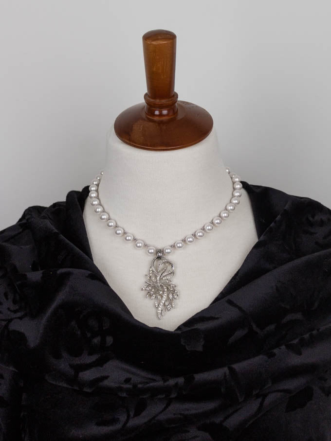 Named for the strong and feisty Titania, Queen of the Fairies in Shakespeare’s A Midsummer Night’s Dream, this one-of-a-kind necklace was created using a vintage brooch pin. Rhinestone dotted Serpentine swirls and winding leaves blend in a dramatic yet delicate design. Such a flattering piece! You’ll adore wearing Titania to any special occasion you have planned.