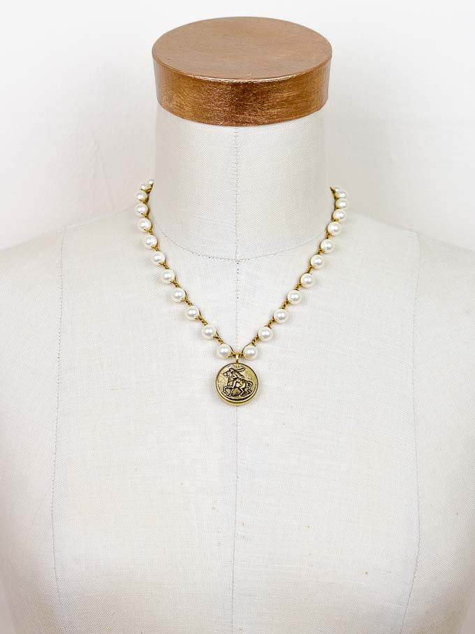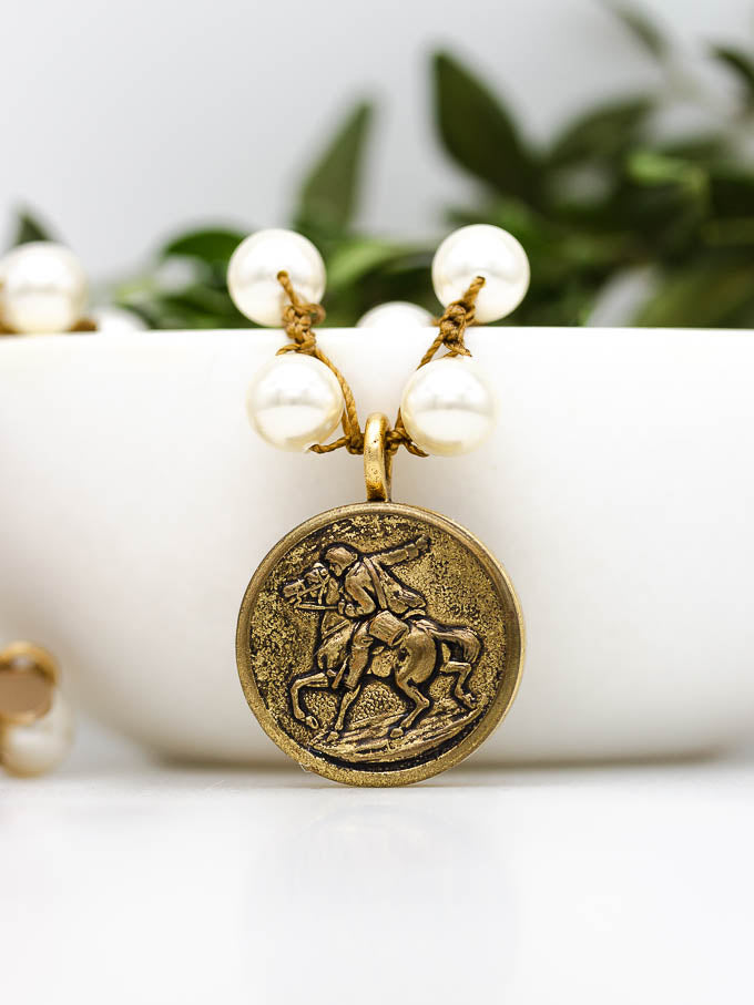 Experience the thrill of the galloping horse and rider with Haste, a striking necklace addition to the Equestrian Collection. Created using an antique button (circa 1890-1930) this piece is certain to spark a conversation! Wear with jeans or a dressier outfit, but make haste - it's one-of-a-kind!