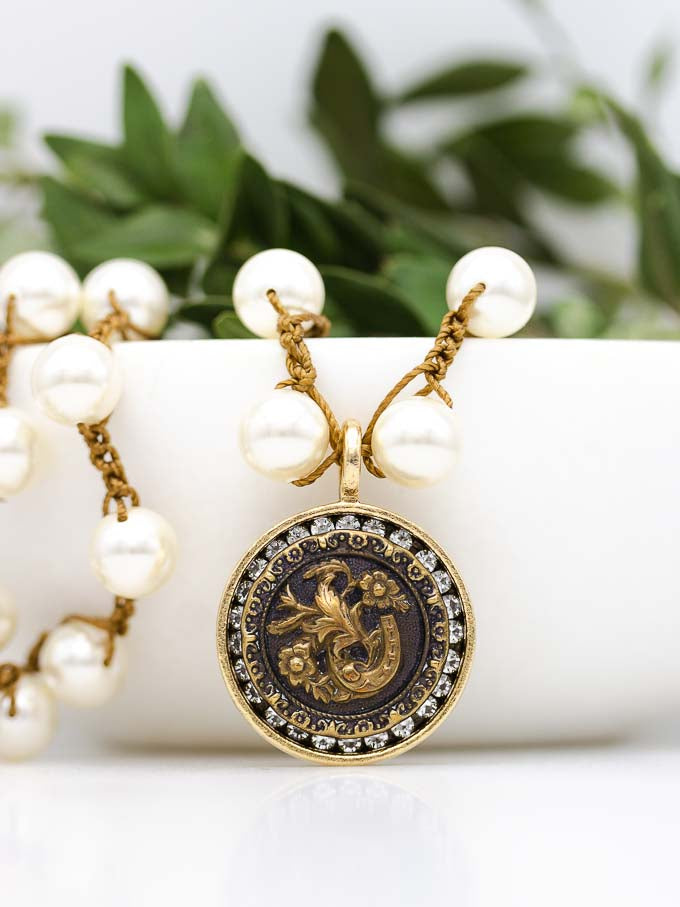 Named Capture for two reasons - one, a horseshoe held upwards is said to capture all the good luck, and two, this piece is certain to capture your heart! Created using an intricately detailed antique button (ca. 1890-1930), Capture features a petite horseshoe tucked within leaves and a pair of flowers. Wear with denim or a dressier outfit, and you're sure to have a generous scoopful of good luck!
