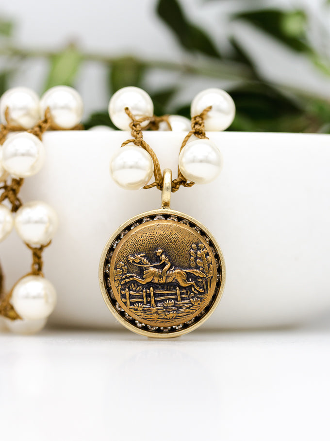 An intricately detailed vintage horse button provides the focal point for Jumper, a perfect necklace for any equestrian enthusiast. Perched upon a swirl of subtle rhinestones, wear this timeless piece with denim or silk - so versatile and lovely!