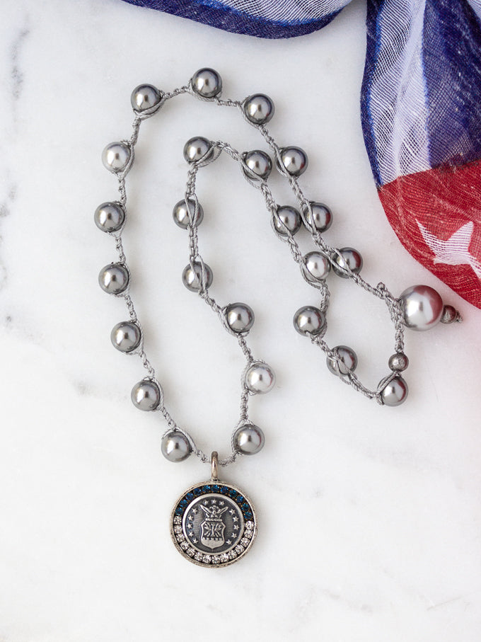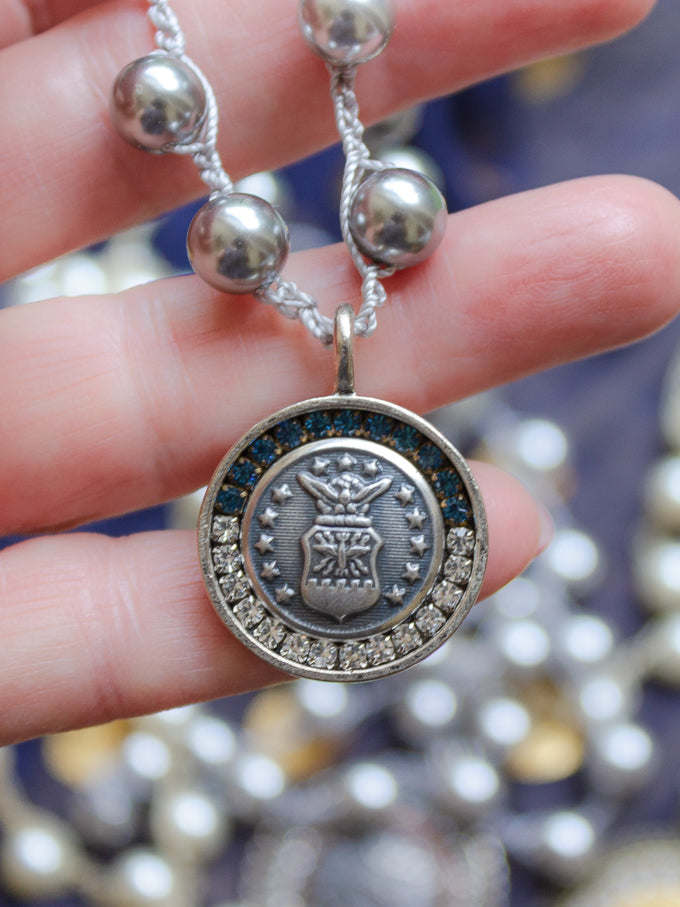 Honor the men and women of our U. S. military - those who've sacrificed their lives to protect us and our nation, and those who have served or are currently serving. This necklace was created with an actual vintage military button. Surrounded with sparkling blue and clear rhinestones, then handstitched onto a chain of silvery grey luxury pearls, you'll share your honor for an American hero wherever you go.