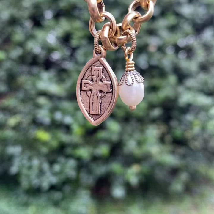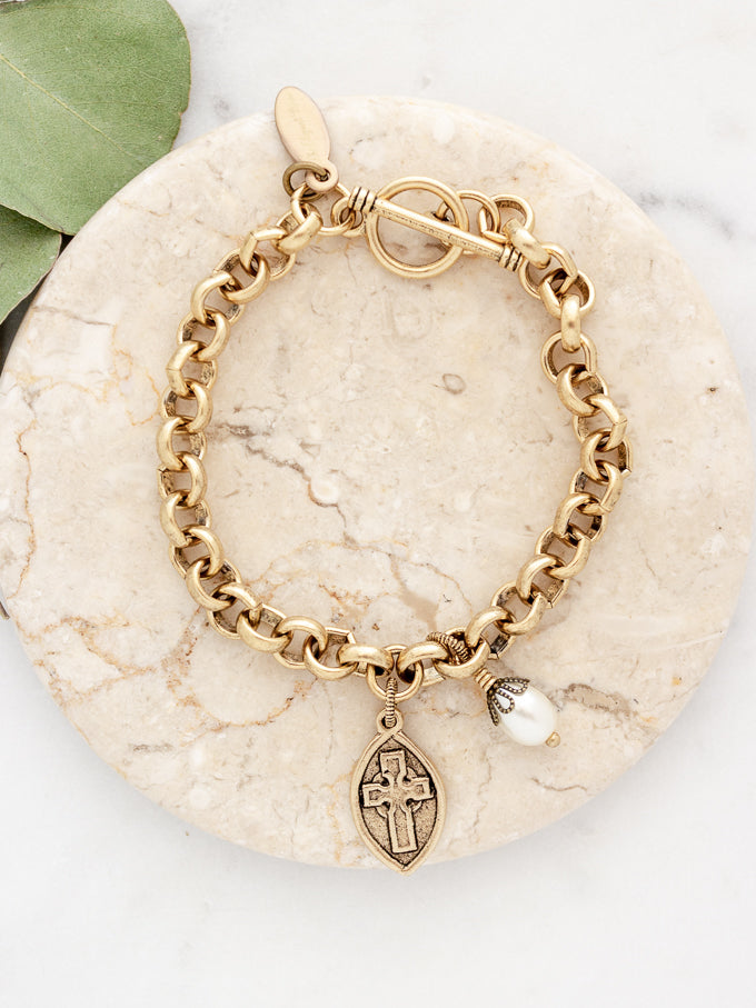 Two-Sided Cross & Dove Charm Bracelet with Pearl