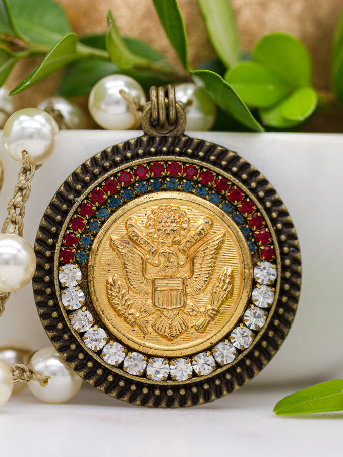 Honor the men and women of our U. S. military - those who've sacrificed their lives to protect us and our nation, and those who have served or are currently serving. This necklace was created with an actual vintage military button. Surrounded with sparkling red, blue, and clear rhinestones, then handstitched onto a chain of creamy white luxury pearls, you'll share your honor of an American hero wherever you go.