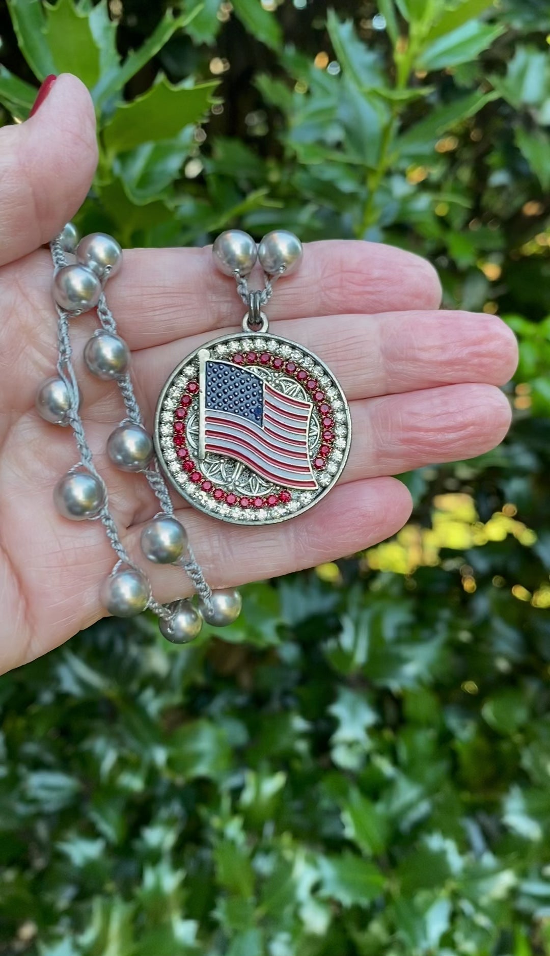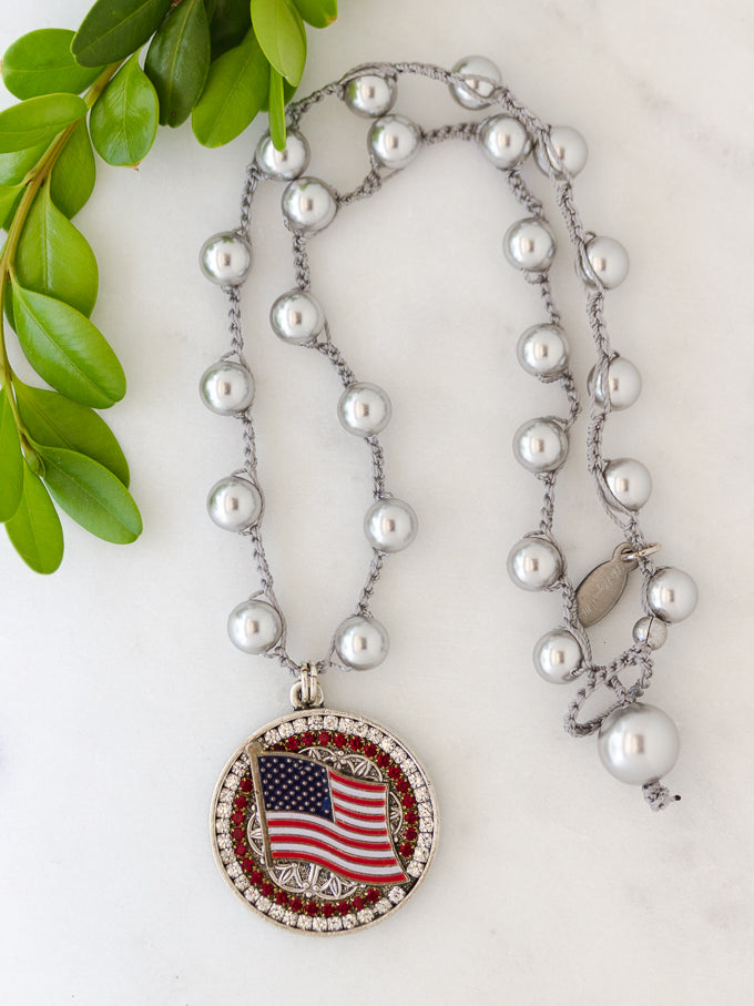 Show your patriotism and celebrate the USA with this one-of-a-kind, handcrafted necklace. Using a vintage U.S. Flag pin obtained in a Virginia countryside antique shop, I placed it atop silvery filigree and surrounded it with sparkling red and clear vintage crystals. Three cheers for the red, white and blue!