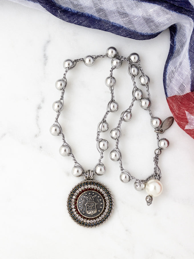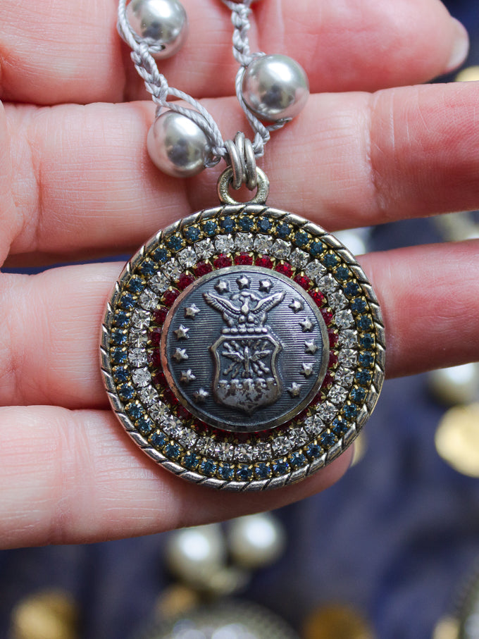 Honor the men and women of our U. S. military - those who've sacrificed their lives to protect us and our nation, and those who have served or are currently serving. This necklace was created with an actual vintage military button. Surrounded with sparkling red, blue and clear rhinestones, then handstitched onto a chain of silvery grey luxury pearls, you'll share your honor for an American hero wherever you go.